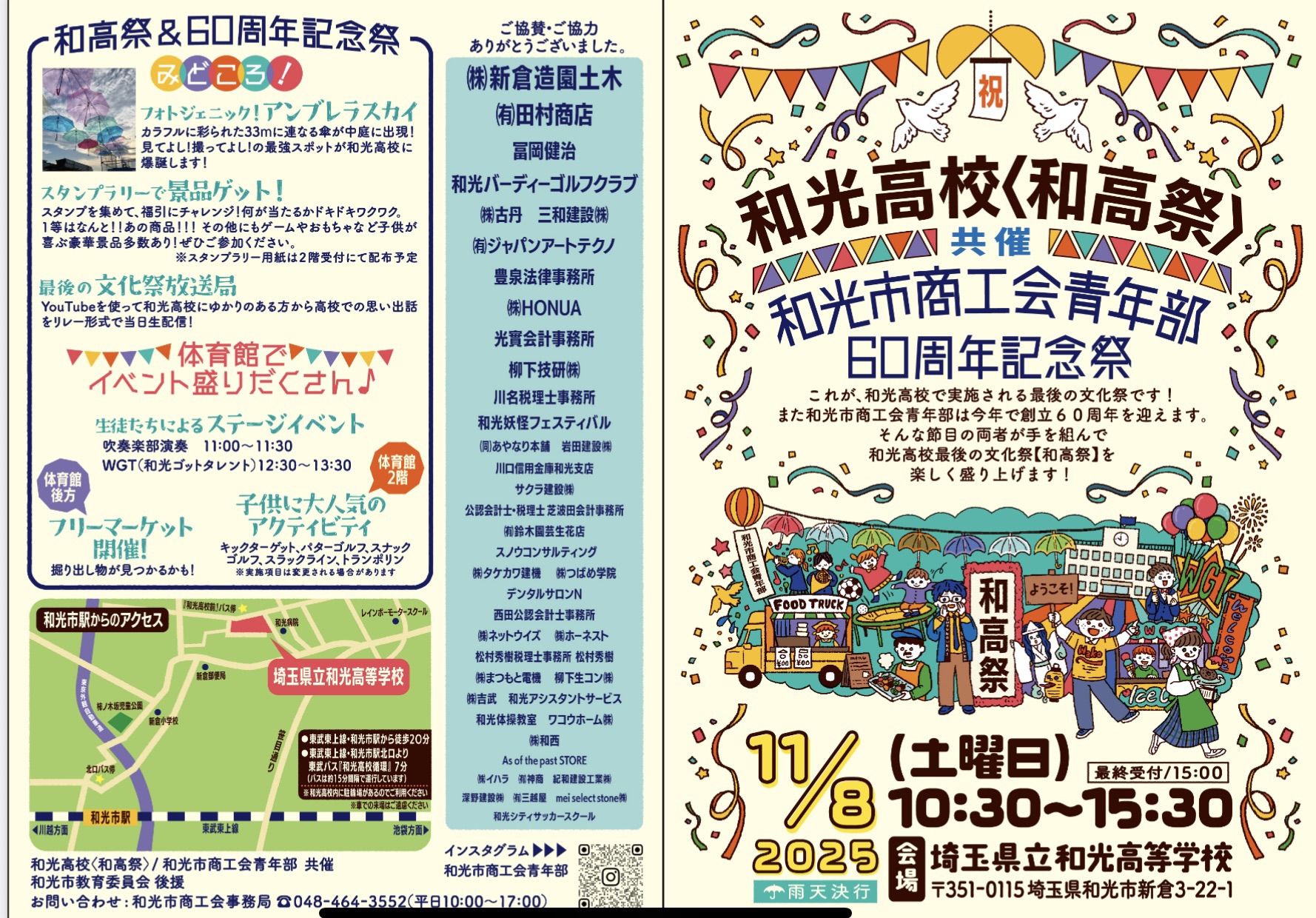 2025年11月8日㈯埼玉県立和光高校にて「和光祭」が開催されます。和光市商工会青年部60周年記念祭も同時開催されるますので、高校生や地域の企業が一体となり、盛大なお祭りとなりそうですね。