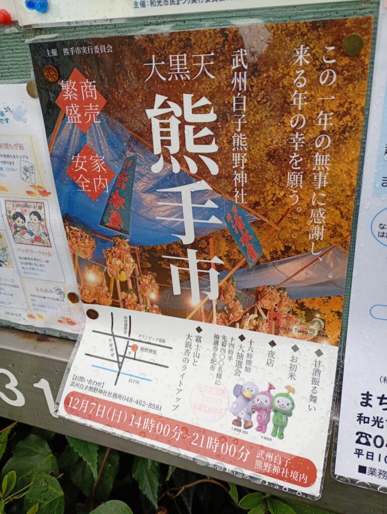 和光2025年12月7日㈰武州白子熊野神社にて「熊手市」が開催予定となります。境内がライトアップされて幻想的な雰囲気に包まれます。よかったら足を運ばれてみてはいかがでしょうか。