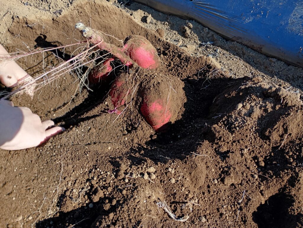 さつまいもの畝にはツルを切った後の収穫ができそうな芋の茎がたくさん並んでいます。砂を少し掘ると大きなゴロゴロとしたさつまいもが!
