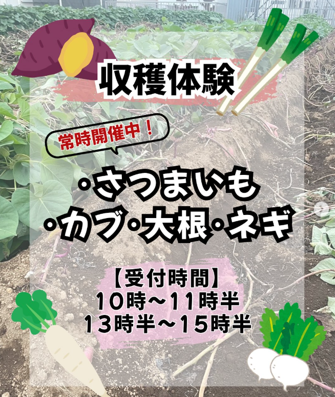 11月中旬に訪れた際は、さつまいもやカブ、ネギに大根といった様々な野菜の収穫体験ができます。