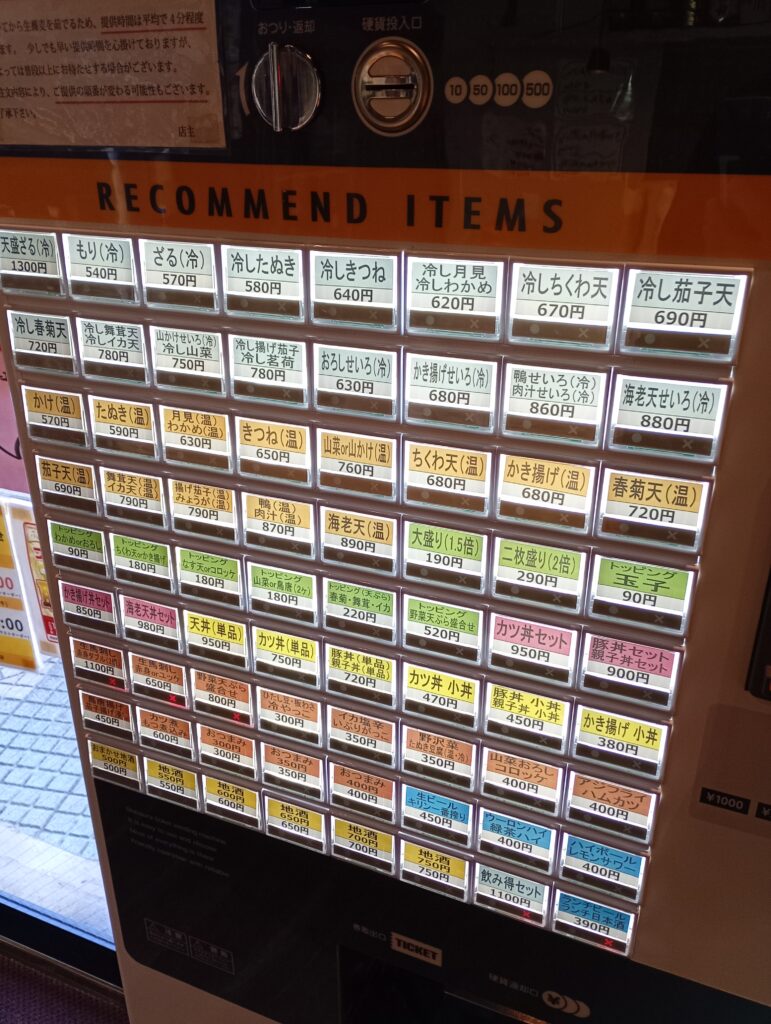 店内に入り食券を購入します。メニューはそばとうどんを中心に、カツ丼や豚丼などのご飯ものもあります。