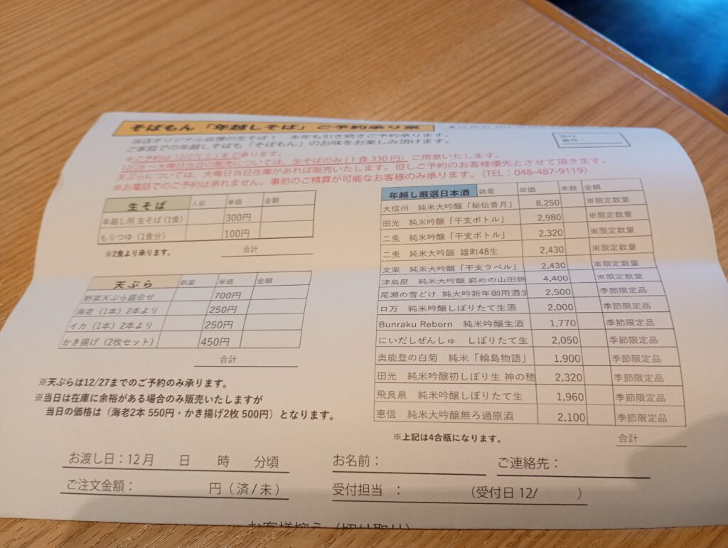 そばを食べている間、年越しそばの注文に来るお客さんが多く来訪していました。そばもんそんでは、大晦日には生そばや海老天の販売を行っており、地域の多くの方が利用しているそうです。