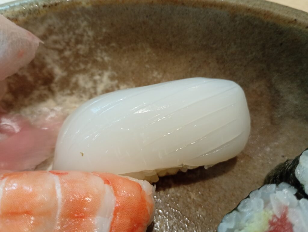 - 美しき包丁の跡 特に印象的だったのはイカです。細かく、そして均等に整えられた包丁の跡が、光を反射して宝石のように輝きます。このひと手間によって、イカ特有の甘みが口の中で一気に開放されるのです。