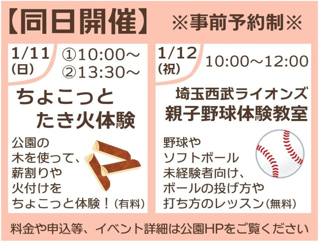 | 1月11日の主な催し | ちょこっとたき火体験(1回目 10:00~ / 2回目 13:30~)公園の木を使った薪割りや火付け体験 |