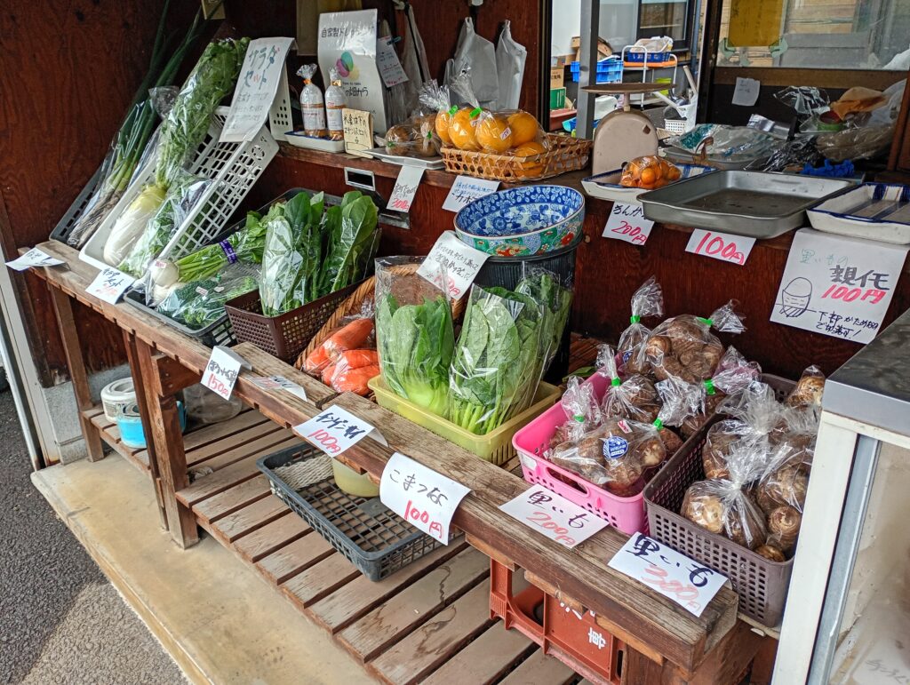 店頭に並ぶのは、まさに今が旬の顔ぶれ。 大きな泥付きの大根、瑞々しい水菜にホウレンソウ、鮮やかなニンジン、そして土の香りがする里芋。