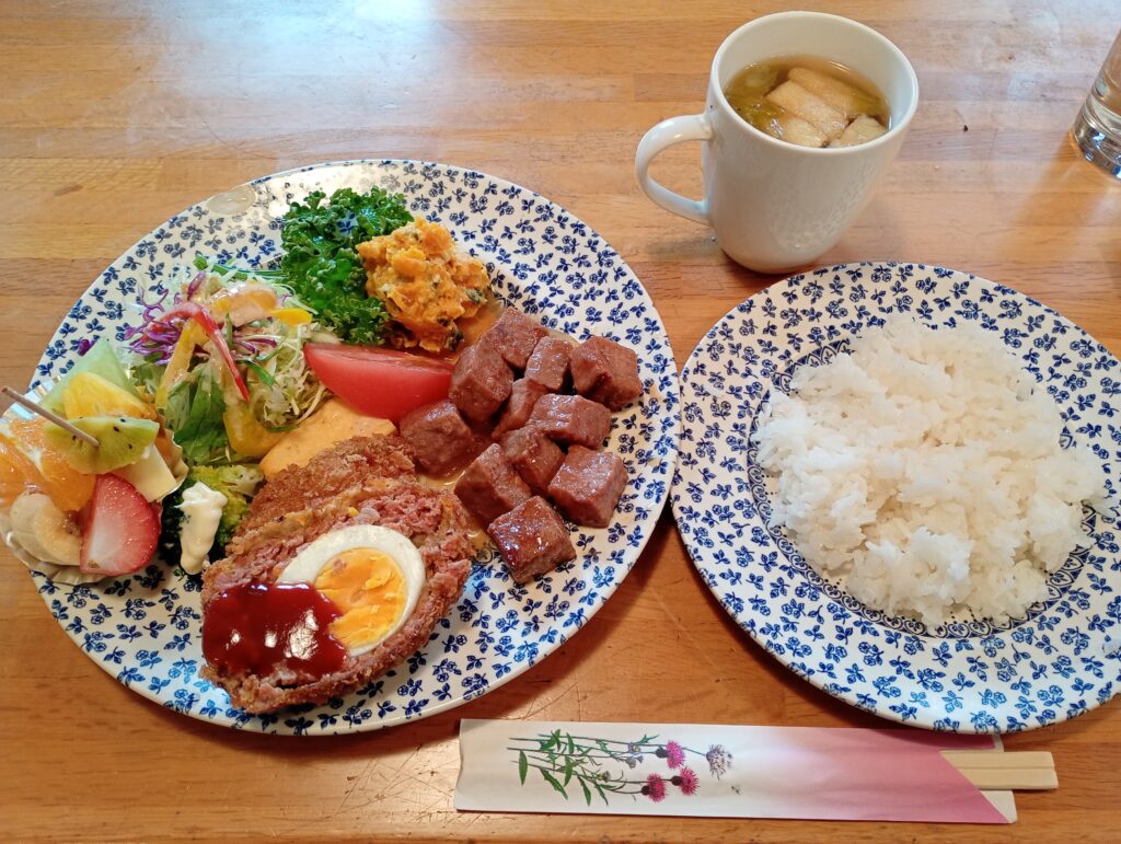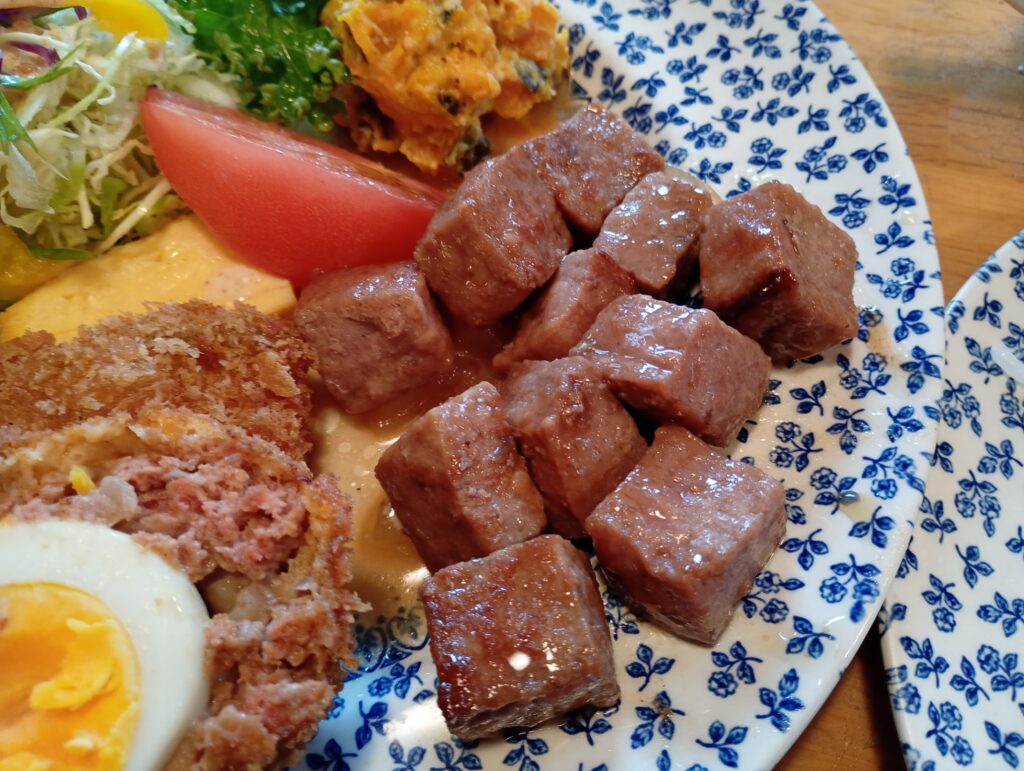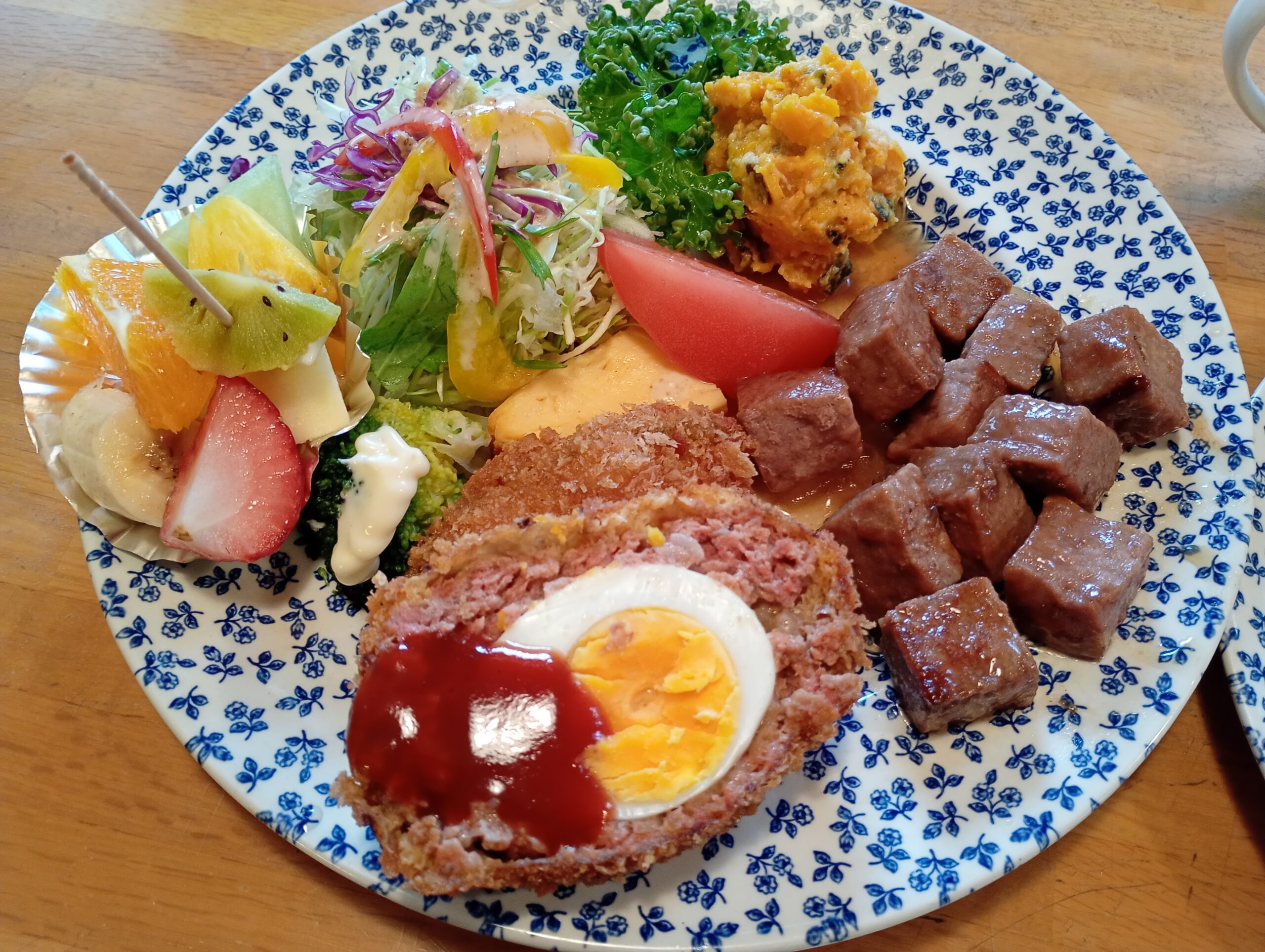 この日のメインは、「サイコロステーキ」と「スコッチエッグ」の豪華なコンビ!