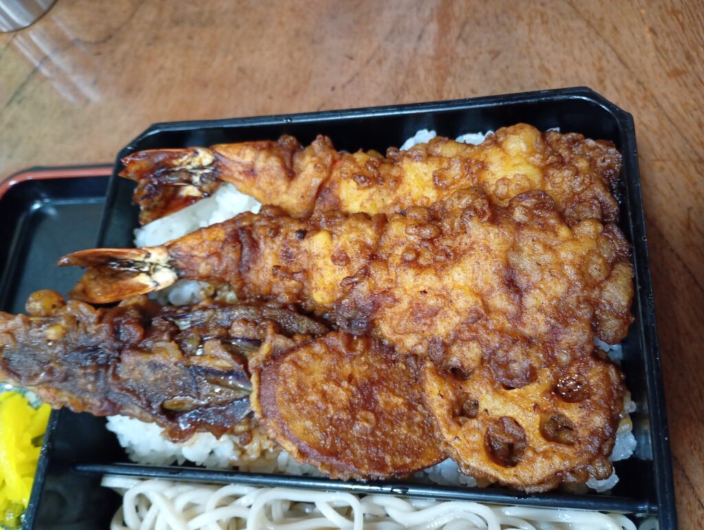 - 天丼: 海老2本、レンコン、サツマイモ、ナス。真っ黒く濃厚なタレが染みた天ぷらは、まさに「食べ応え満点」の一言。