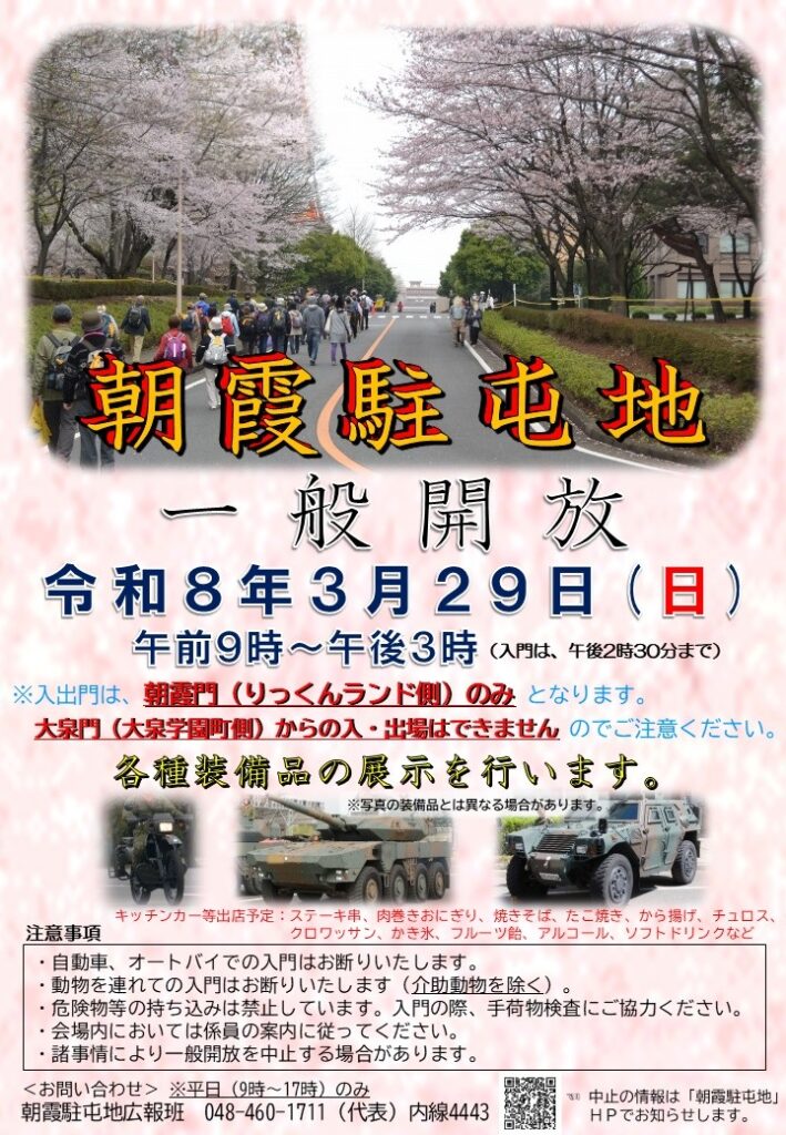 令和8年 陸上自衛隊 朝霞駐屯地 観桜一般開放|2026年3月29日(日)|陸自調査団