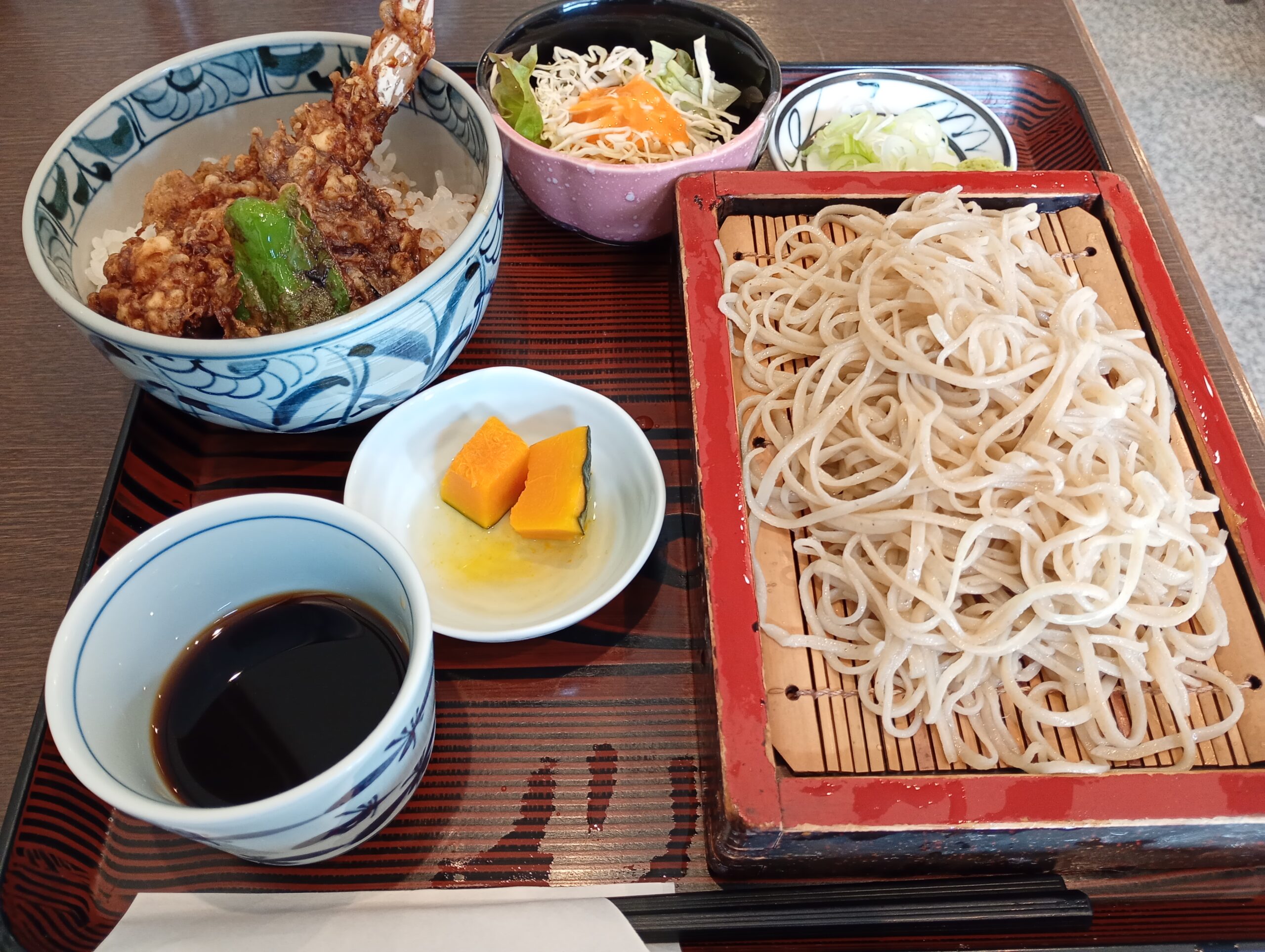 待つこと約5分。運ばれてきたお膳には、お蕎麦と天丼だけでなく、サラダ、おしんこ、そして付け合わせの「かぼちゃ」まで添えられていました。