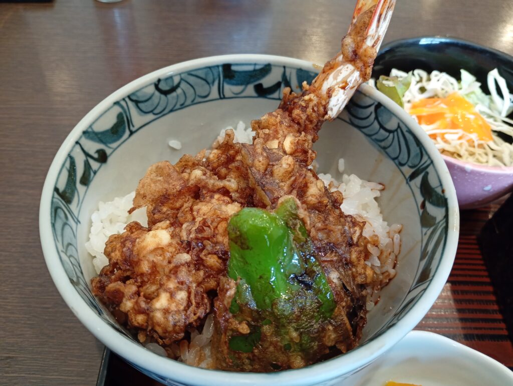 - ミニ天丼 大きな海老が1匹に、きゅうり、茄子の天ぷらがのっています。濃いめの甘いタレが衣にしっかり染みていて、ご飯が進む味付けです。