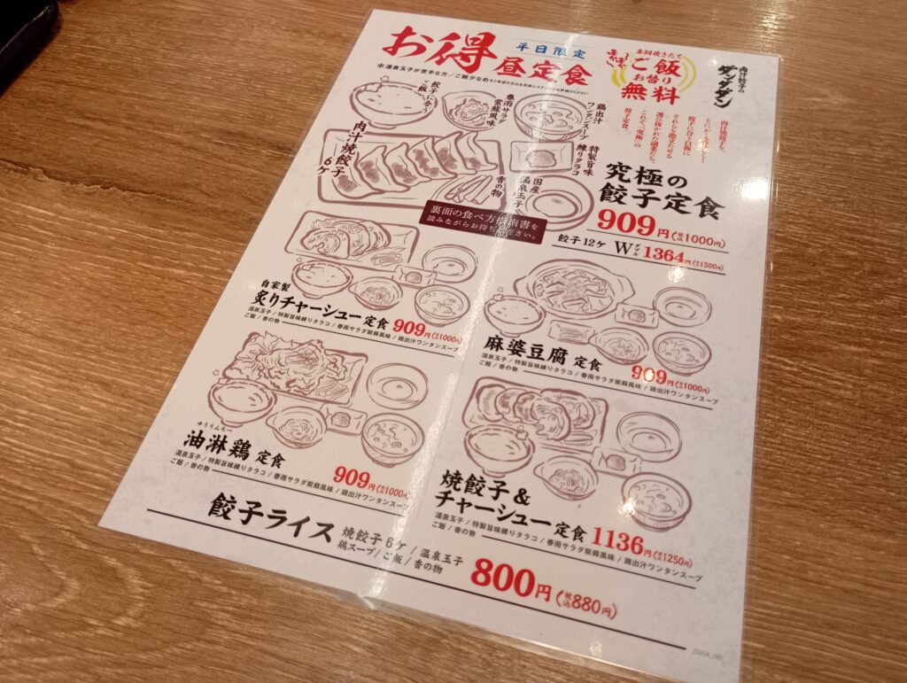 テーブルにもランチメニューがおいてありましたが、今回は一押しの「究極の餃子定食」1,000円を注文いたしました。
