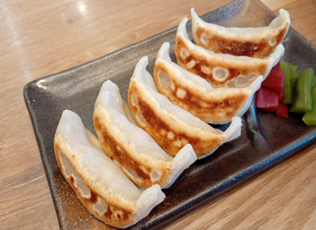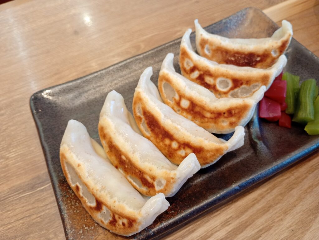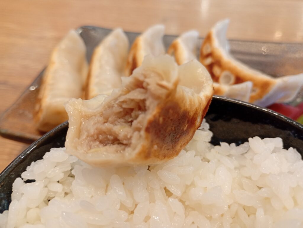 綺麗な焼きめのついたマルマルとした餃子が6個提供されました。中には肉汁が詰まっており、餡に味付けがされているので調味料をつけずにそのまま食べられます。