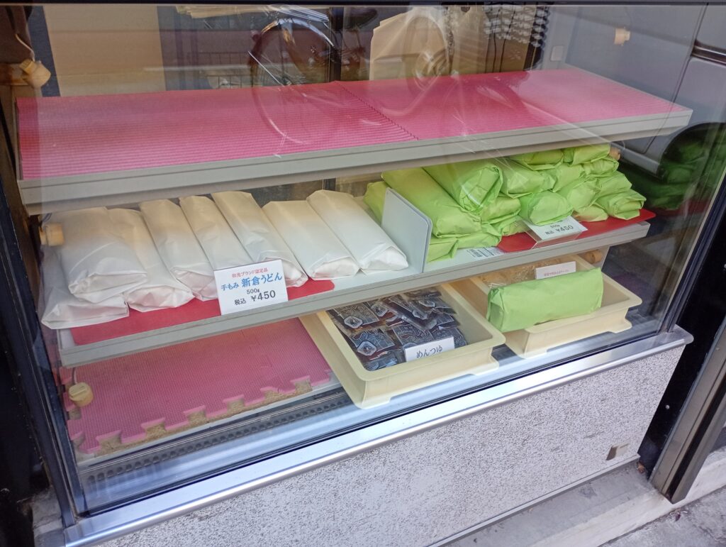 ショーケースには、名物の新倉うどんはもちろん、そばや中華麺、餃子の皮、ワンタンの皮まで、たくさんの種類の麺が並んでいました。